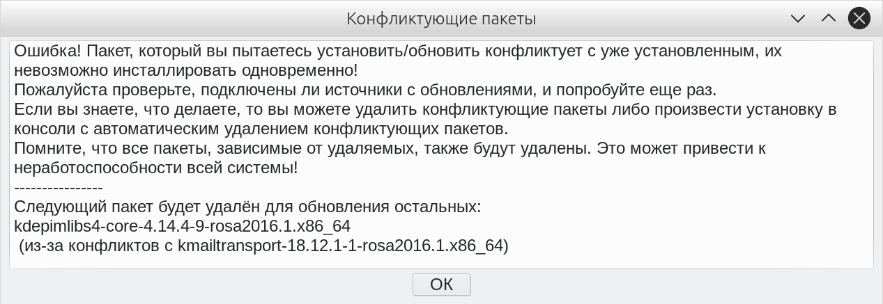 Да, но откуда он взялся? Какая-то программа притащила?VictorR2007 писал(а): 31 авг 2019, 13:08 Там говорится, что в системе конфликтующий пакет kdepim от KDE4.