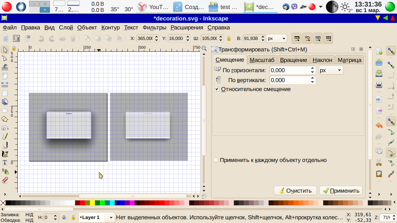 Внутри файла для каждой кнопки могут содержаться несколько объектов для разных случаев использования данной кнопки. Какие именно? Самый стандартный случай — просто открыто активное окно. Для такого случая имеется отдельный объект — рисунок, изображающий кнопку именно в этом состоянии (active-center). Теперь касаемся кнопки курсором. Что произошло? Может ничего не произойти, а может быть выведен другой объект svg файла, отвечающий за отображение кнопки при наведении курсора (hover-center). Наконец, нажимаем кнопку — объект может остаться прежним, а может быть выведен уже третий — все зависит от объектов внутри файла (pressed-center). Итак — три возможных изображения — обычное состояние, наведение курсора на кнопку и нажатие на кнопку. Это только для активного окна. Для неактивного окна можно добавить еще до трех объектов — обычное состояние неактивного окна (inactive-center), наведение (hover-inactive-center) и нажатие (pressed-inactive-center). Итого уже шесть возможных объектов. Но и это еще не все — можно добавить еще отдельные объекты для деактивированных кнопок, причем отдельно для активного (deactivated-active-center) и неактивного деактивированного окна (deactivated-inactive-center).