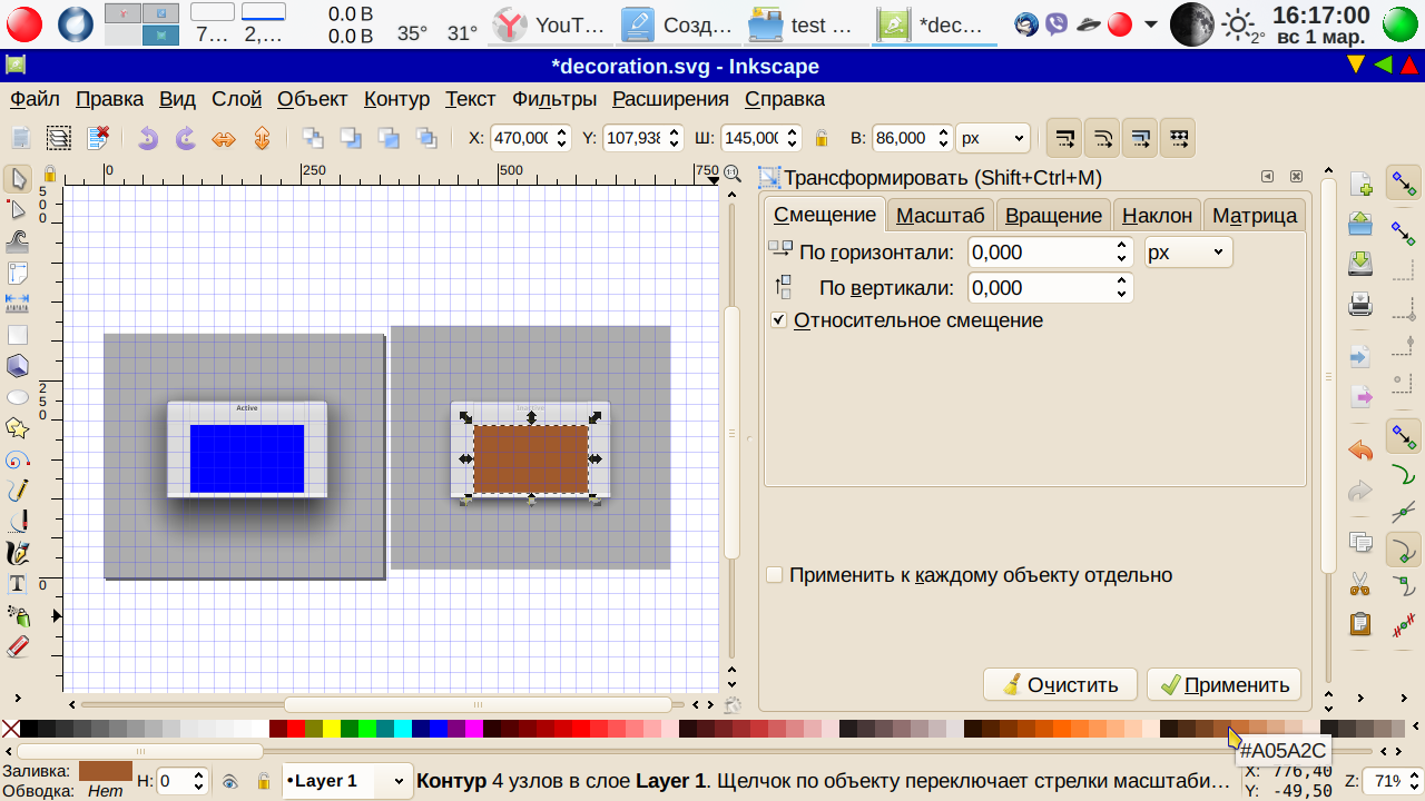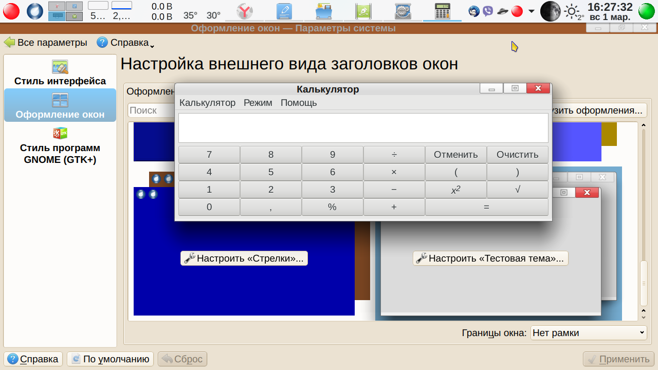 Кстати, если сделали не правильное телодвижение, то всегда можно отменить действие: Меню-→Правка-→ Отменить:<Наименование отменяемого действия>. Теперь сохраняем файл. Просто сохраняем как есть. Меню-→Файл-→ Сохранить. Пусть остается svg, паковать пока не будем. Переходим теперь в Параметры системы → Оформление окон (промежуточные вкладки для краткости опускаем). Что у нас получилось? А получилось… ничего. Как была тема, так и осталась. В чем дело? Вот тут мы подошли к еще одной трудности, с которой, судя по отзывам, многие сталкивались — изменения внесены, но ничего не изменилось. А что если применить нашу чуть измененную тему? В «Параметрах системы» изменения вступили в силу — заголовок активного окна синий, неактивного, как видно из скриншота — коричневый. А вот, скажем Калькулятор МАТЕ остался серым. Серой же осталась тестовая тема в окне выбора в Параметрах системы.