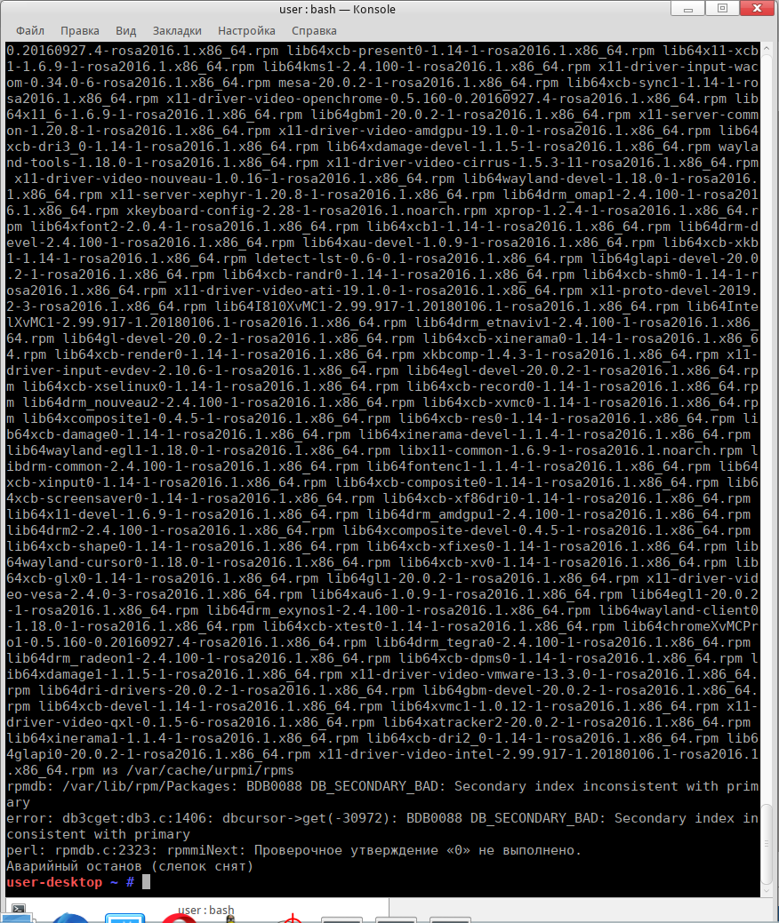 Victor вроде заработала rpm база. Я систему удалять не стал а просто установил рядом другую. Теперь когда набираю sudo urpmi --auto-update система обновляется без ошибок. Это у меня была проверочная команда. При сломанной rpm при выводе этой команды были ошибки. Теперь все работает. Ну я еще ядро обновил по этой теме viewtopic.php?t=9640. Правда вывод команды dmesg | less так и остался такой но экран уже не гаснет. И все как раньше.VictorR2007 писал(а): 01 апр 2020, 10:26Всему виновато это решение.