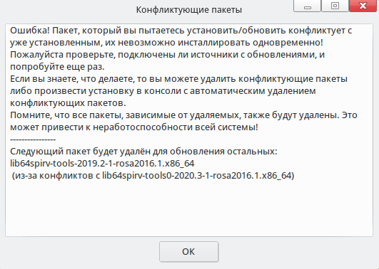 Zeffanyx писал(а): 08 июл 2020, 18:27 Подобные проблемы существуют тут годами. Если коротко, то lib64spirv-tools-2019.2-1 и lib64spirv-tools0-2020.3-1 воспринимаются urpmi как два несвязанных пакета, хотя в теории это должен быть 1 пакет в разных версиях.