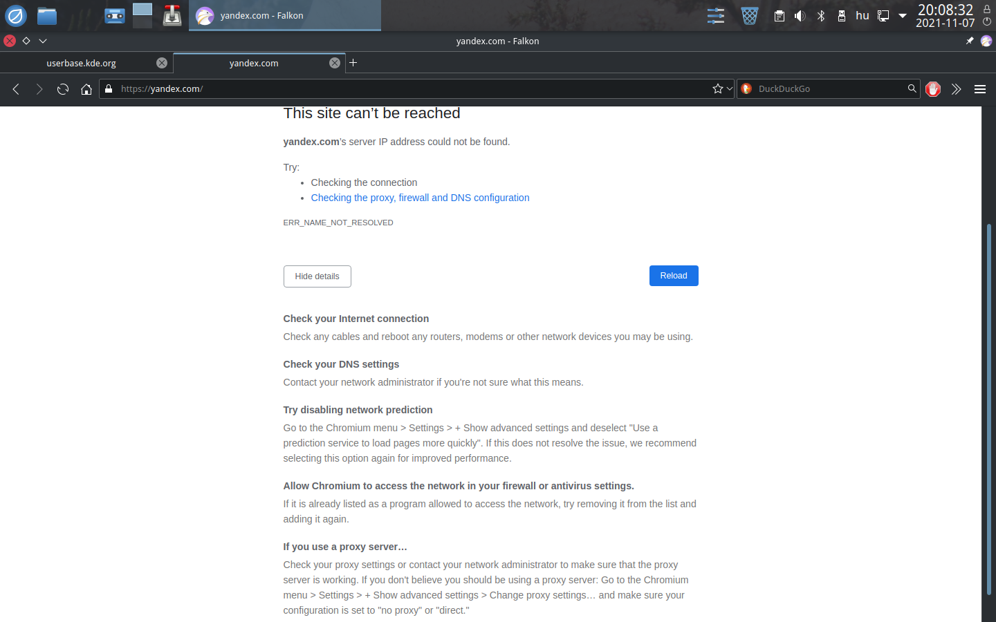 Pages opened in the Falkon browser indicate a "server IP address could not be found" error, and the system the Chromium browser settings recommended ( after it has been completely[ ? ] removed... pict. 1).