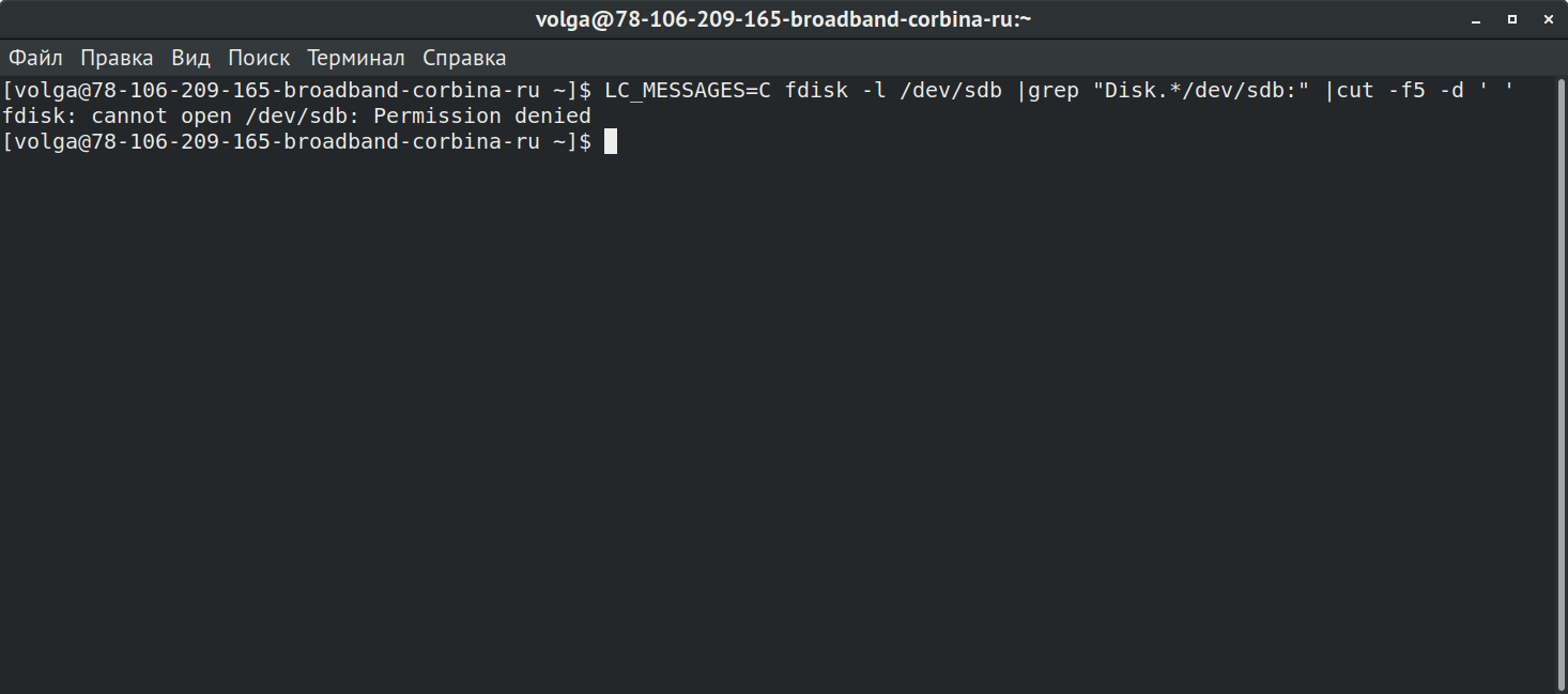 LC_MESSAGES=C fdisk -l /dev/sdb |grep "Disk.*/dev/sdb:" |cut -f5 -d ' '