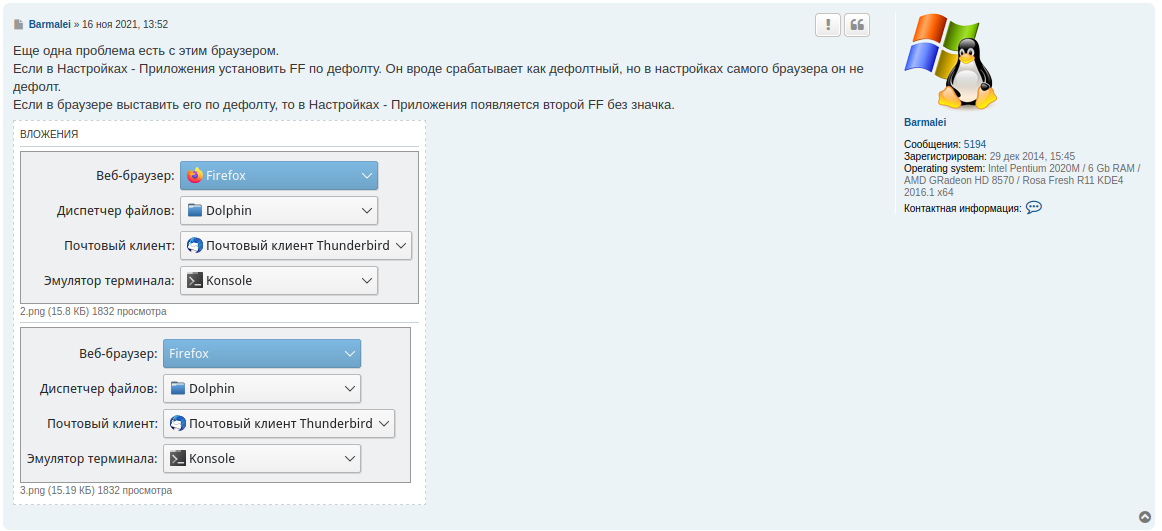Вот второй глюк непонятный и вызывает недоумение, как его лечить я не знаю. В скриншоте приложу. Суть в том, что в настройки -> приложения по умолчанию - появился ещё один пункт FireFox без иконки, ещё до того как я перешёл на 91.7, но и с ним он присутствует. Но тут интересно то, что если выбрать FireFox с иконкой, из выпадающего списка, то сбрасывается настройка в FireFox, что он браузер по умолчанию, было и в 98 и точно так же в 91.7 esr. А вот когда в браузере выбрать, что он браузер по умолчанию, то в настройках перескакивает на пункт без иконки, как на приложенном скриншоте. Возникает вопрос, это лечится как-то, или только обновлением компонента Gnome, которого пока нет?
