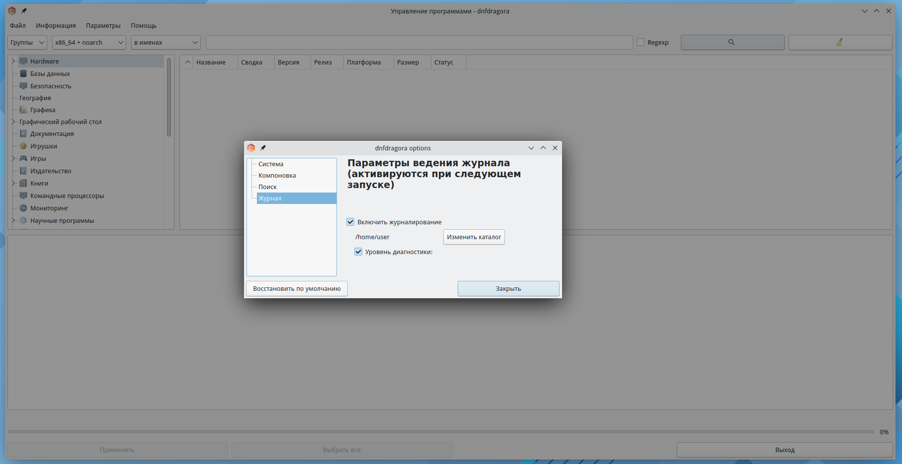 Есть ещё момент. Логирование dnfdragora отключено для пользователя. Включать вот тут в пользователських предпочтениях:
