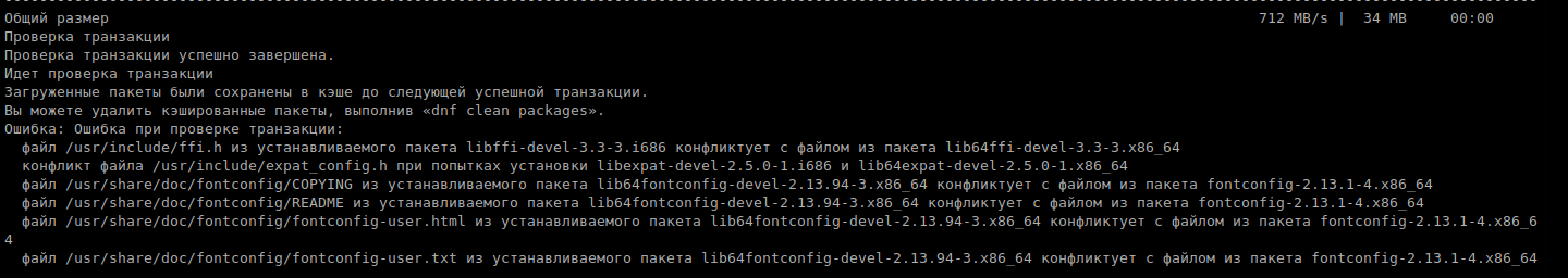 irton, Обновление fontconfig помогло. Огромное вам спасибо. Только в терминале показывает ещё один конфликт с файлом libffi-devel-3-3-3. i686. Помогает dnfdragora файл-репозитории. И там надо убрать галочки с i686.