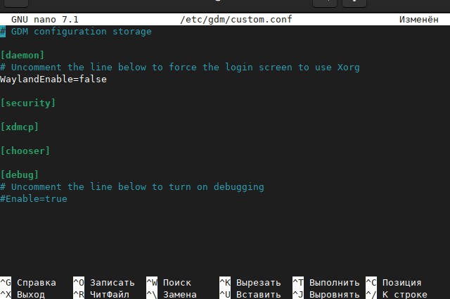 Но шестеренки в углу нет. Теперь надо попробовать рекомендацию как то/etc/gdm/custom.conf раскоментировать строку #WaylandEnable=false.