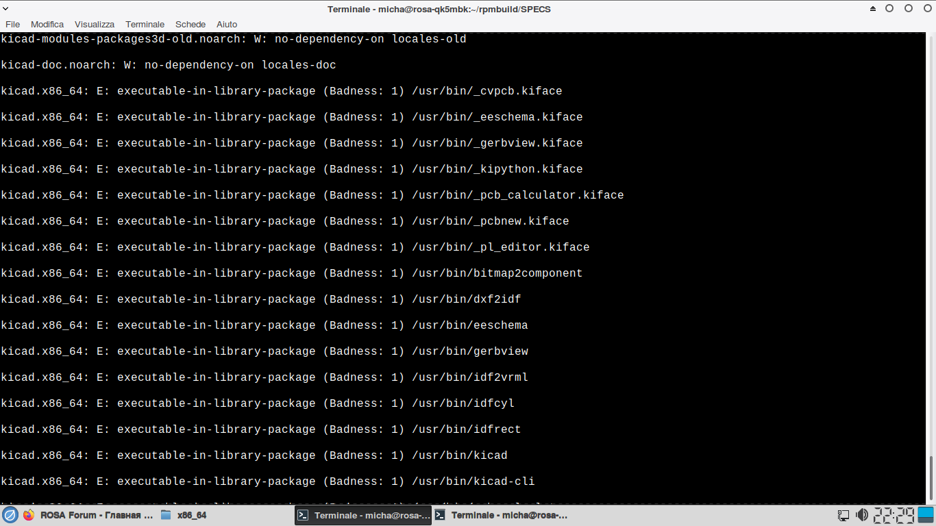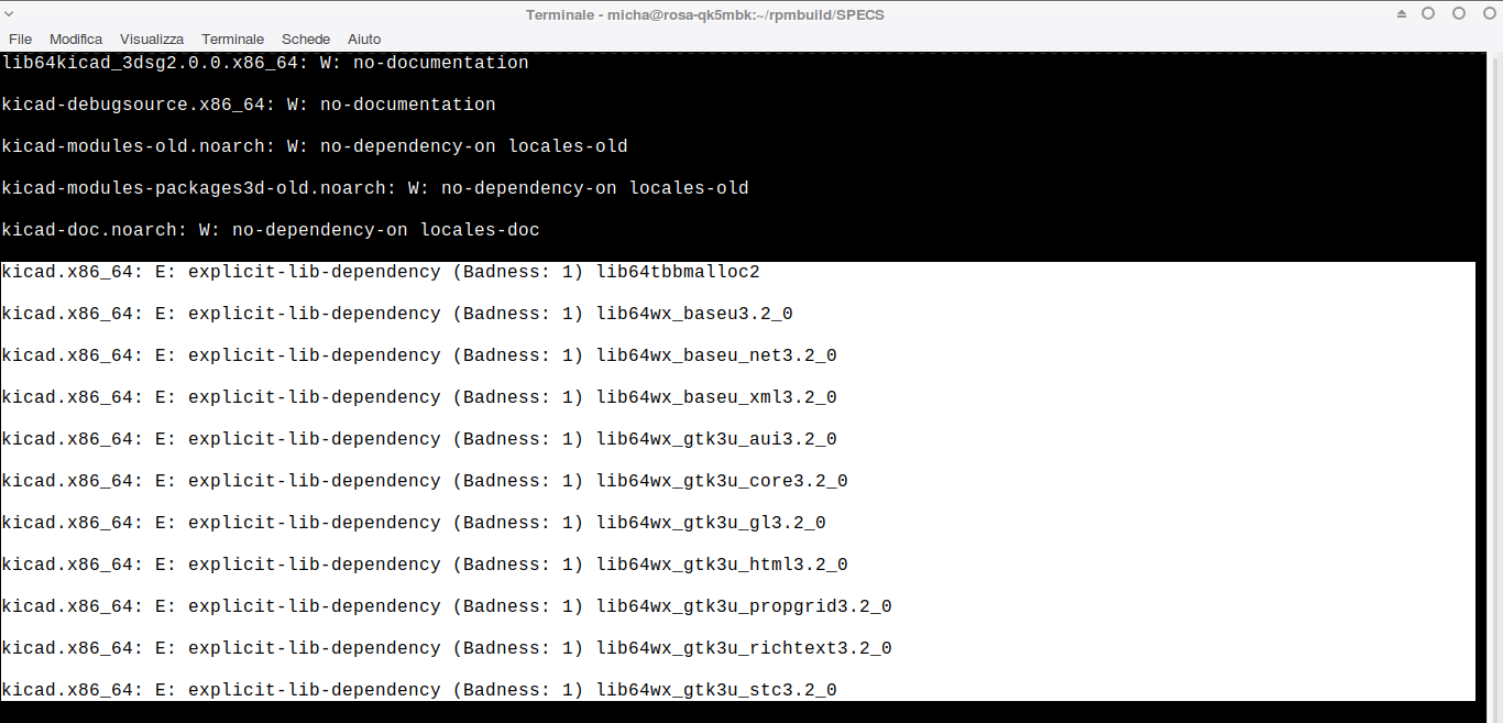 2° passo: aggiunto file "kicad.rpmlintrc" poiché avevo oltre 600 (pseudo)errori di questo tipo: