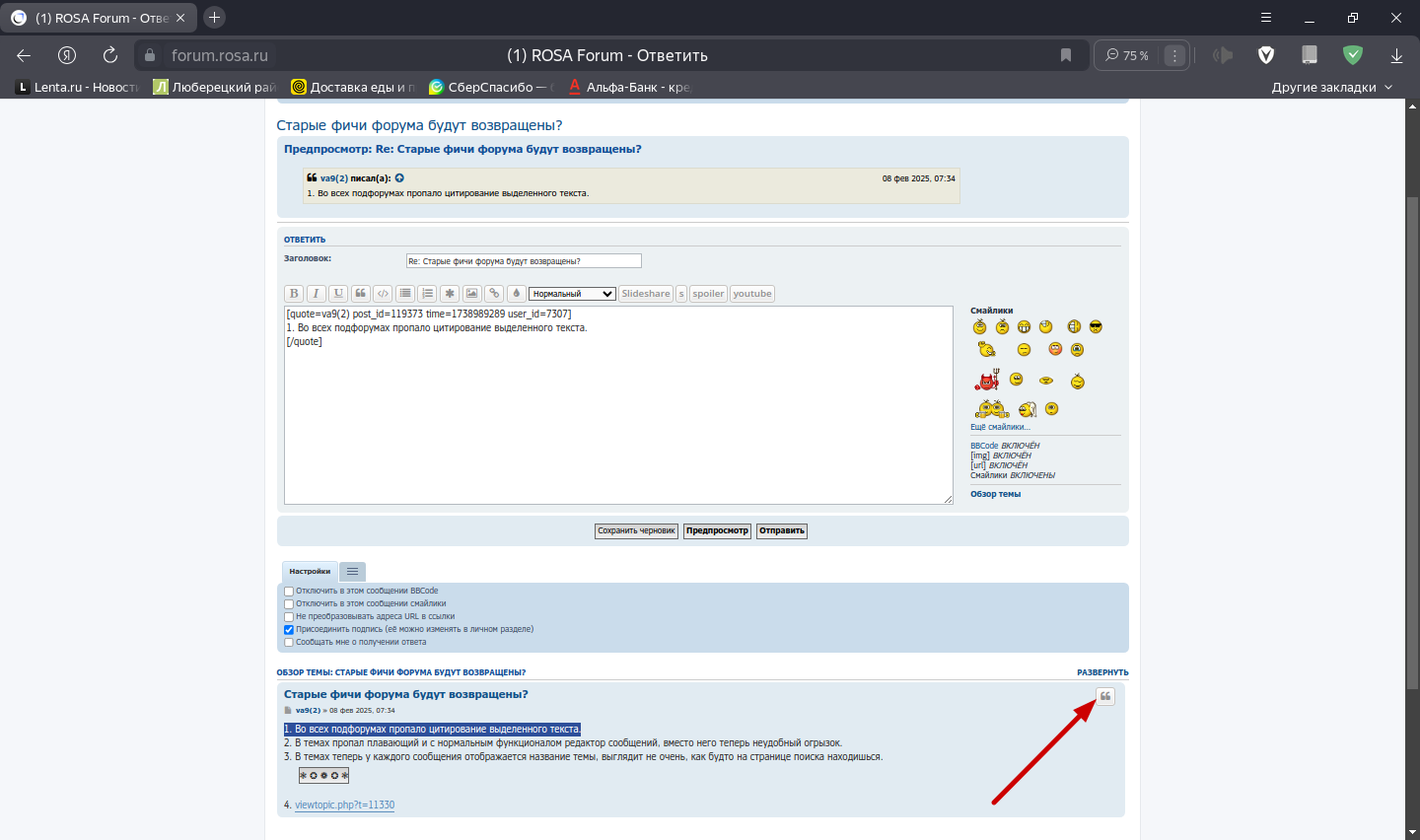 va9(2) писал(а): 08 фев 2025, 07:34 1. Во всех подфорумах пропало цитирование выделенного текста.