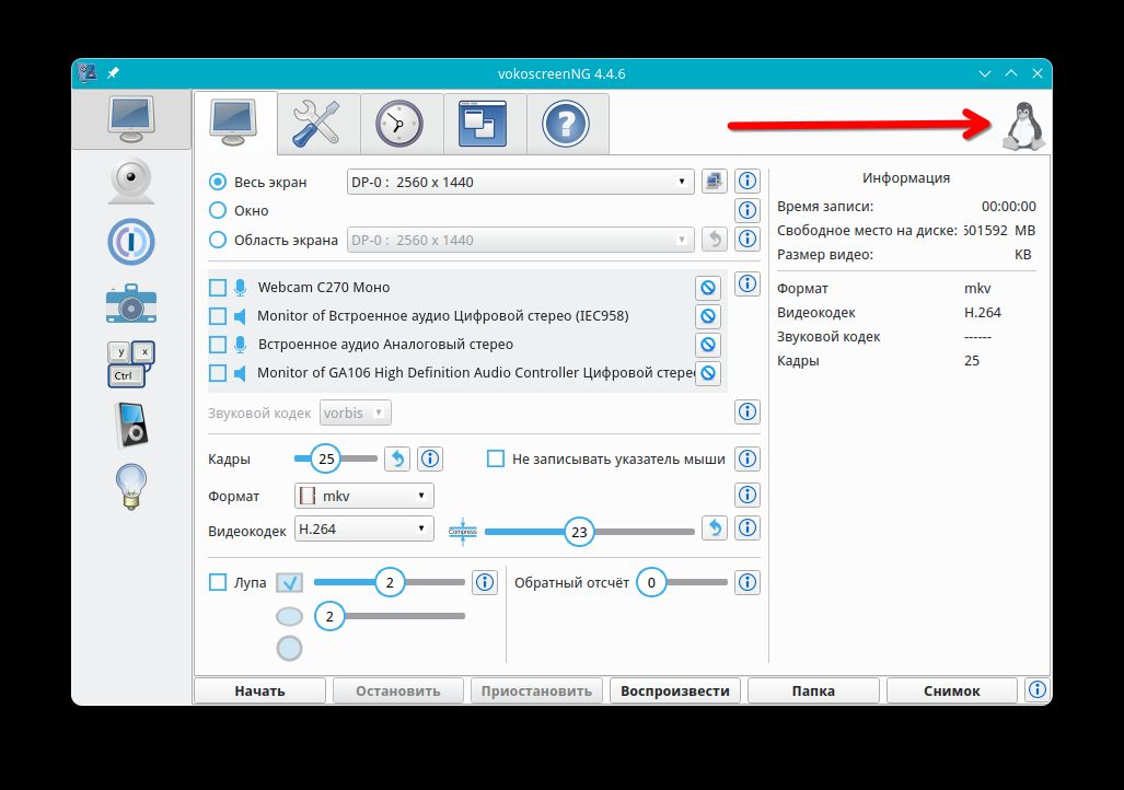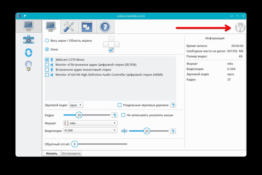 Интерфейс у vokoscreen на wayland немного отличается от версии x11.