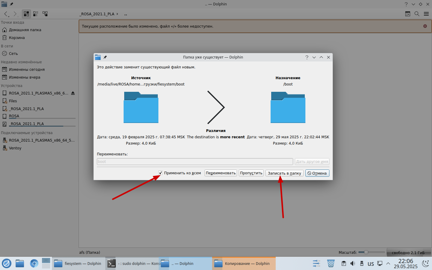 Странно....turik02 писал(а): 29 май 2025, 19:31Можно попробовать загрузиться в live. В корне удалить папки bin, lib, lib64, sbin (в /usr/ их не трогаем). Потом скачать архив, распаковать его и скопировать содержимое папки filesystem (18 папок) в корень (подтверждаем замену), открыв Dolphin командойКод: Выделить всё