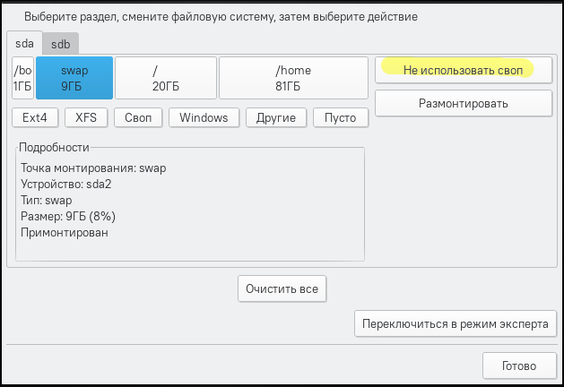 Настроить правильно разделы можно с помощью диспетчера разделов kde, или gparted. Ну или по статье, которую я привел выше.