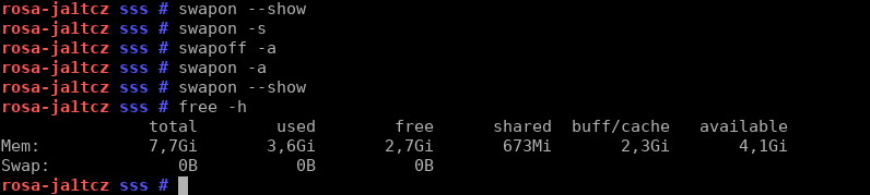 СПАСИБО! Подсказки помогли. В файле fstab была не правильно указана точка монтирования, надо swap без слеша, и неправильный формат этого раздела, было ext4 вместо swap. Все это у меня образовалось при установке Росы. Второй закоментированный /home это следы переноса этого раздела на другой диск, чтоб не забыть как было в начале. Еще раз спасибо.