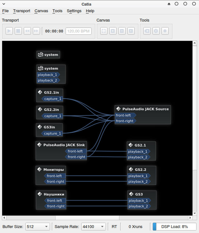 Как решить вопрос семплрейта мне подсказал turik02 в теме про Vitalium, за что ему большое спасибо! А вот с захватом звука у меня затык. В PipeWire я приноровился делать посыл вручную при помощи Catia, но, во-первых, это непрактично, а во-вторых, PipeWire воспринимает каждое приложение отдельно и замечает их только тогда, когда они звучат, т.е. я не могу послать звук с компьютера в мессенджер заранее, как это было с общим входом в JACK, вначале мне приходится открыть мессенджер и сказать что-нибудь в микрофон, чтобы PipeWire обнаружил Chromium Input - такие себе пляски с бубном. На втором скриншоте Chromium - это браузер, из которого звук идет на колонки, а Chromium Input - это мессенджер, который забирает звук с микрофона и с колонок. Я не знаю, почему все называется Chromium, нужный результат я получил методом научного тыка.