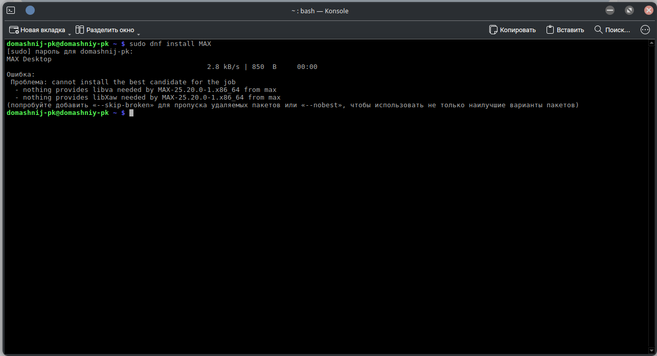 Если вы про пакет, который вы предоставили тут https://disk.yandex.ru/d/LS0zxRXl7-R0bAMOT писал(а): 16 дек 2025, 15:38 В общем, победил я новую версию "Максимки" в РОСЕ. Но далось сие дорого - уронил Плазму6. Хорошо образ системы был. Установить новую версию мессенджера можно только заменив более новые библиотеки установленные в системе старыми ( вытянул из РЕД ОС 8 ). При этом тянутся зависимости почти всей KDE6.