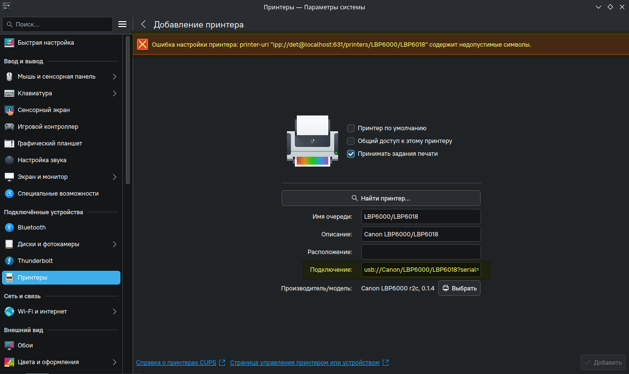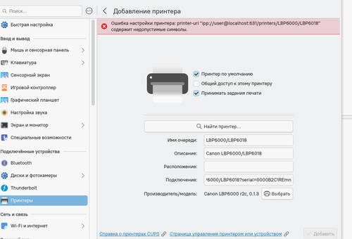 1). После установки вышеуказанных пакетов в базе драйверов появилась данная модель принтера, однако через "Параметры системы" - "Интсрументы настройки компьютера" снова выпала ошибка - "содержит недопустимые символы" и принтер не добавляется в систему.