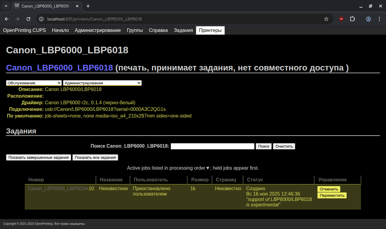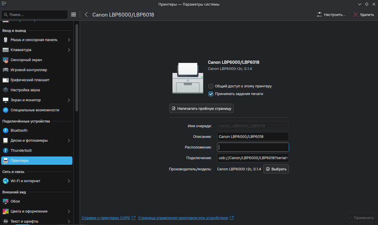 nickm писал(а): 16 ноя 2025, 11:05Только есть одно, важное примечание/ замечание - устанавливать/ настраивать принтер требуется с помощью веб-интерфейса CUPS, так, как в системном окне настройки принтера не получится совладать с URI подключения принтера.