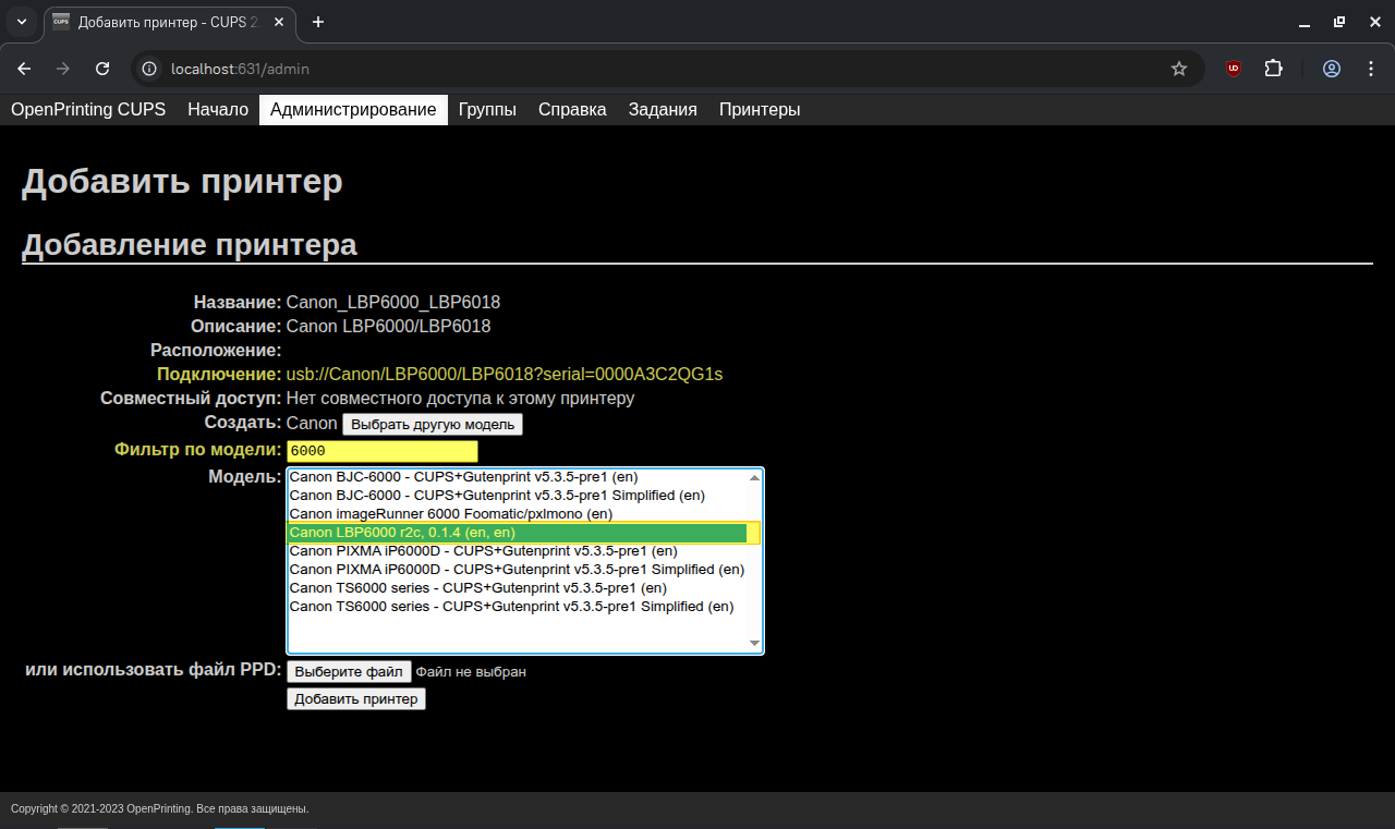 Установка принтера в CUPS