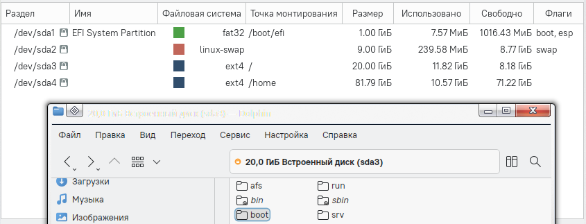 У меня Долфин пишет: занято 765 МиБ, свободно: 128,2 МиБ.kartavenko писал(а): 03 фев 2026, 18:12 У меня /boot/efi занимает 512 Мбайт и все ок. Сама папа /boot 401 Мбайт.