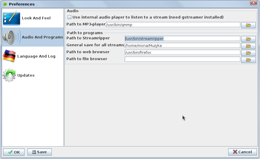 dareksmok писал(а):StreamRipStar is a java written graphical frontend (gui) for streamripper, which saves separate options for each stream. In addition is has a scheduler and can load stream from the web.