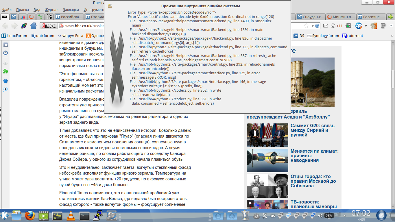 Сторонних реп нет. Обновления почти ежедневные, последнее вчера вечером (с обновлением источников).Zeffanyx писал(а):Какой-то из пакетов Питона не обновился. Надо отключить все сторонние репы и сделать urpmi --auto-update.