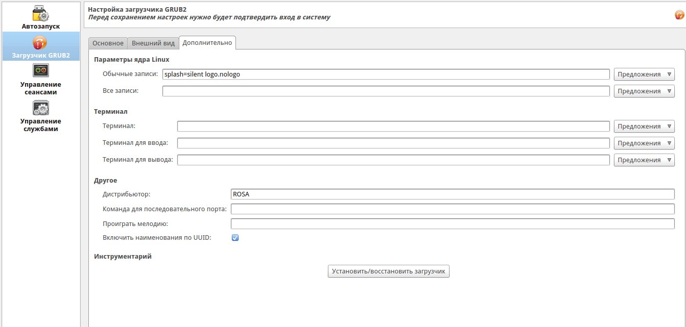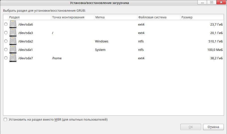Есть такая возможность в Росе установить/восстановить загрузчик. Но тут только возможность выбрать раздел жесткого диска , а при изначальной установки Росы например есть возможность выбрать не раздел а сам жесткий диск.