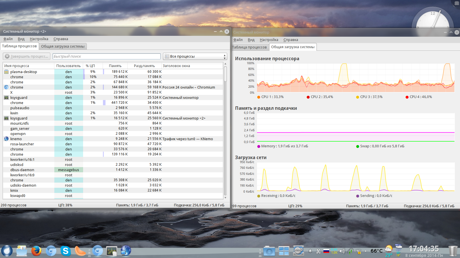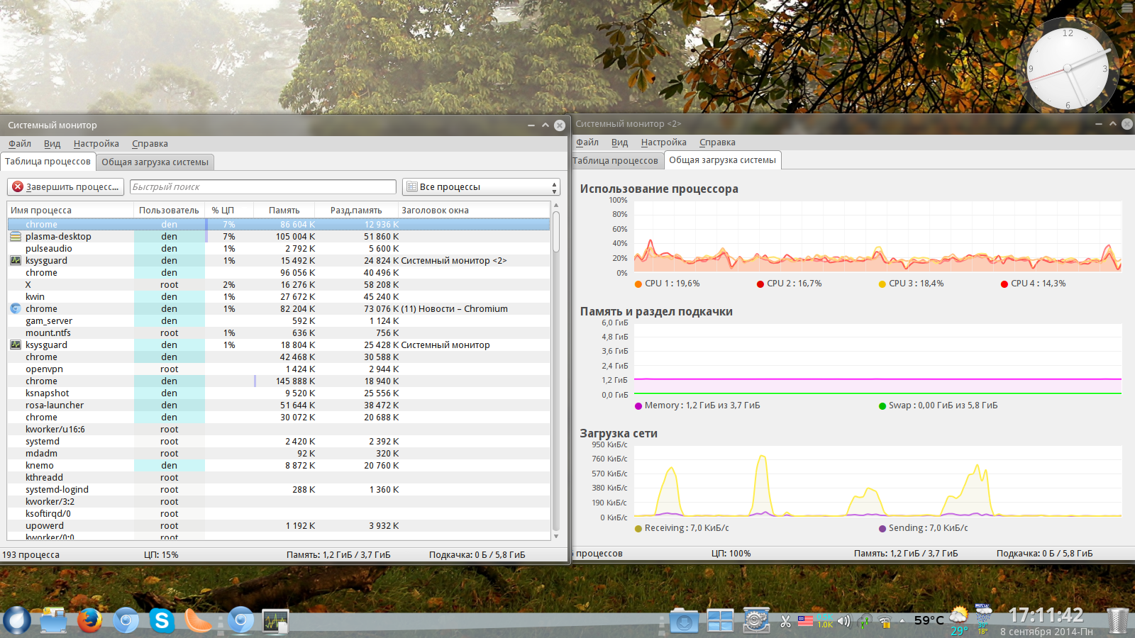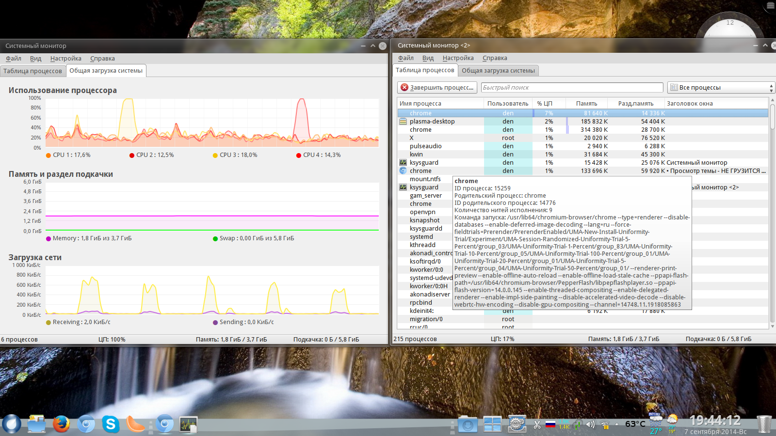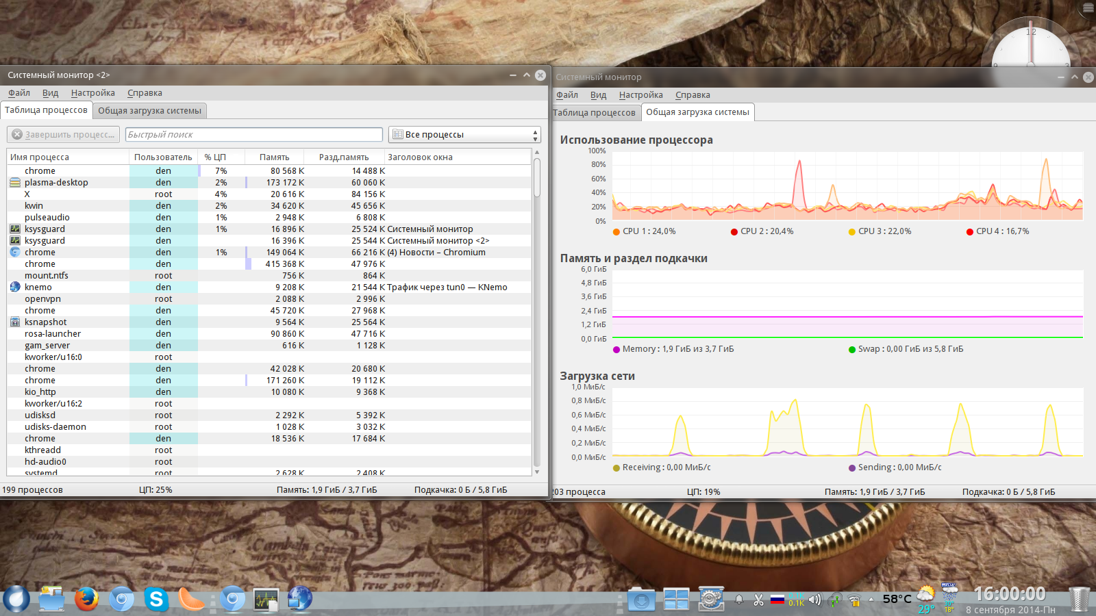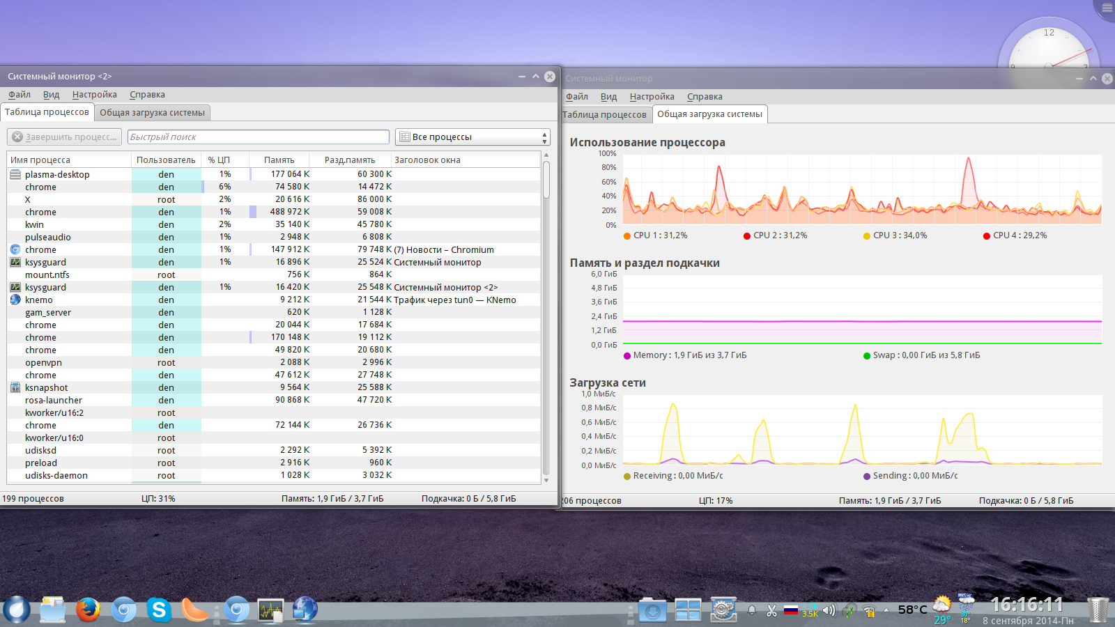 Если бы знаний хватало я бы попробовал и ждать в текстовом режиме часа три четыре я так понимаю........по системному монитору в момент пика загрузки процессора всегда вылетает на первый план процесс plasma-desktop