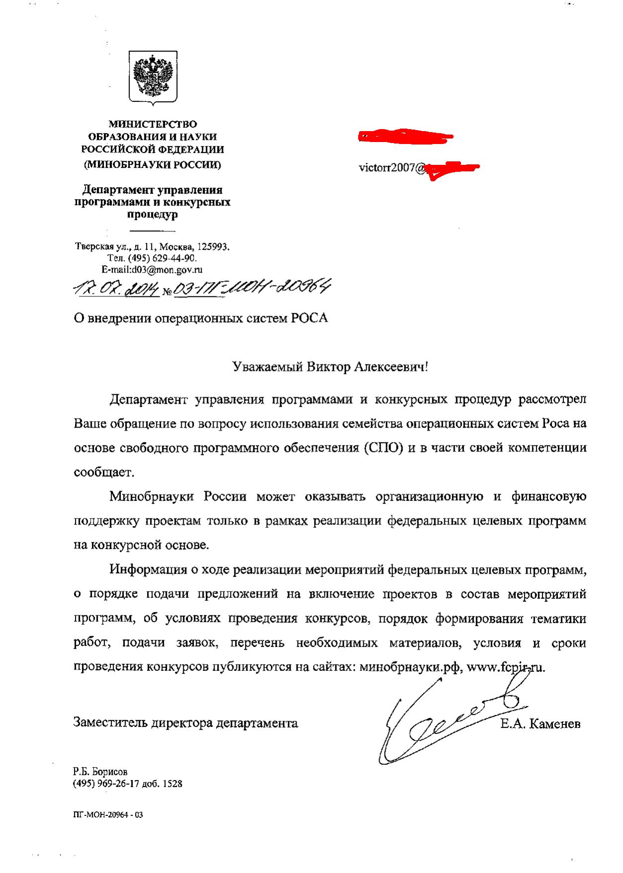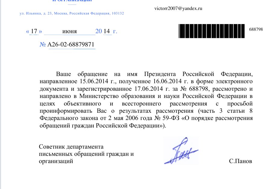vlad писал(а):VictorR2007, по моему Вас пнули, обычная отписка. Посмотрим как отпишется Министерство образования и науки (если вообще отпишется).