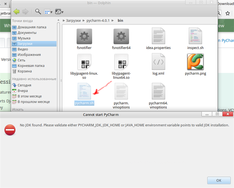 Просьба помочь! При попытке запустить PyCharm из файла .sh - он жалуется, что ему не хватает jdk.