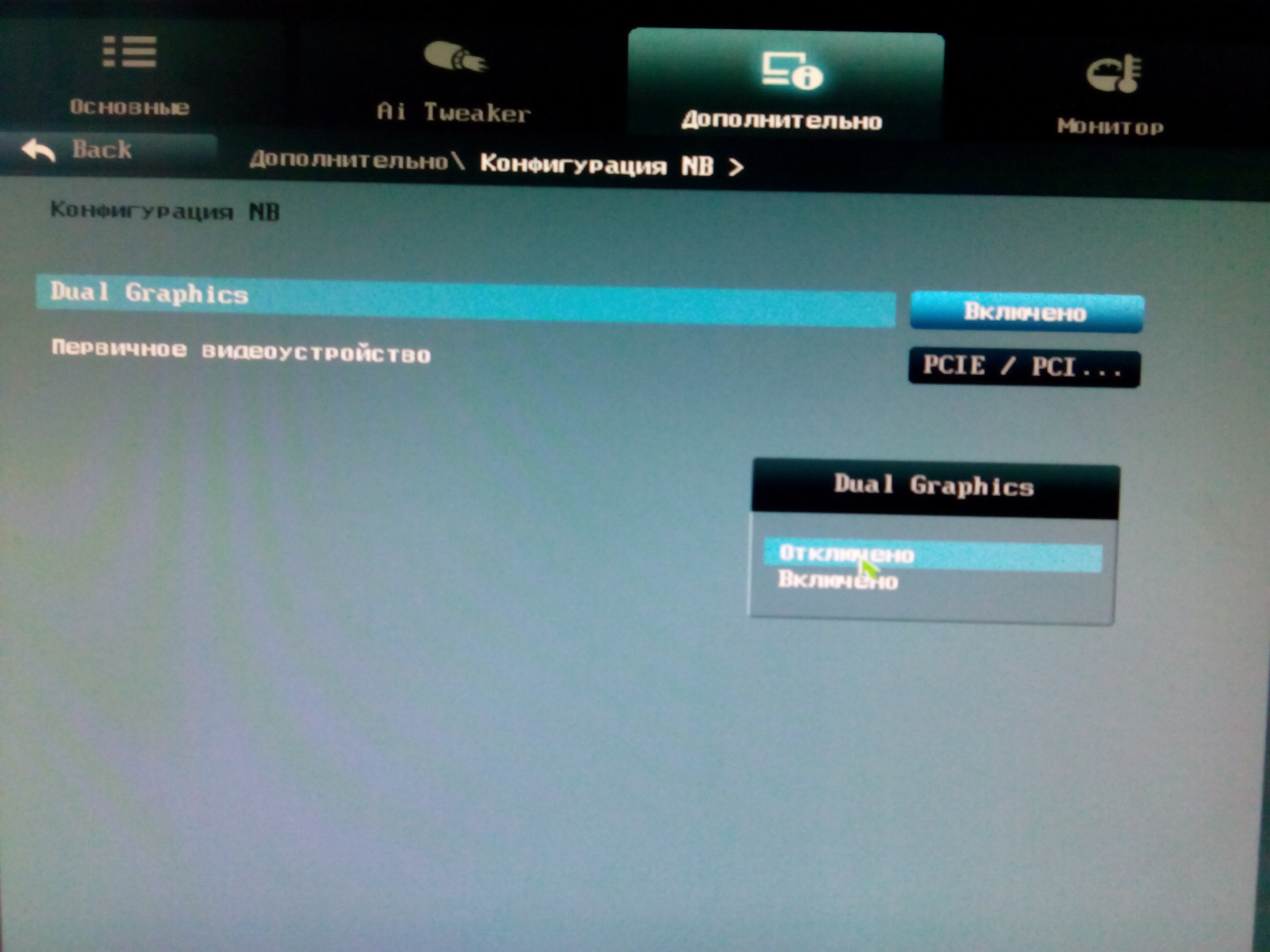 KA-25 писал(а): В биосе есть пункт, дуал графика вкл или выкл. Так вот, когда включаю ее, то система грузится в черный экран. Когда выключаю, то все норм.