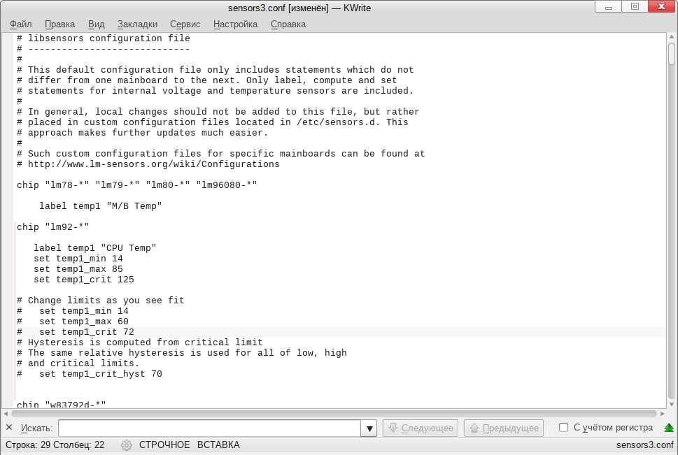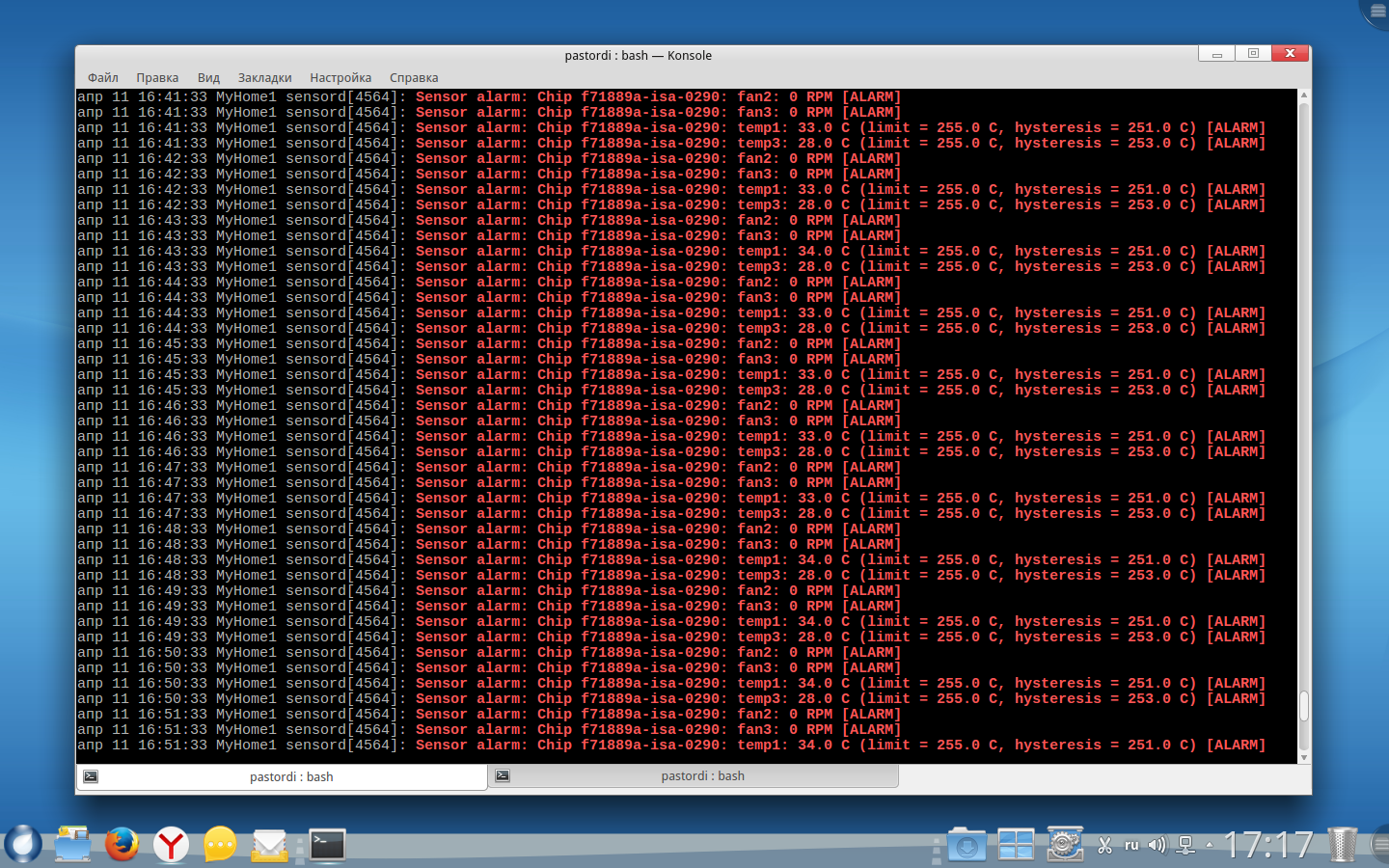 апр 11 16:48:33 MyHome1 sensord[4564]: Sensor alarm: Chip f71889a-isa-0290: temp1: 34.0 C (limit = 255.0 C, hysteresis = 251.0 C) [ALARM]
