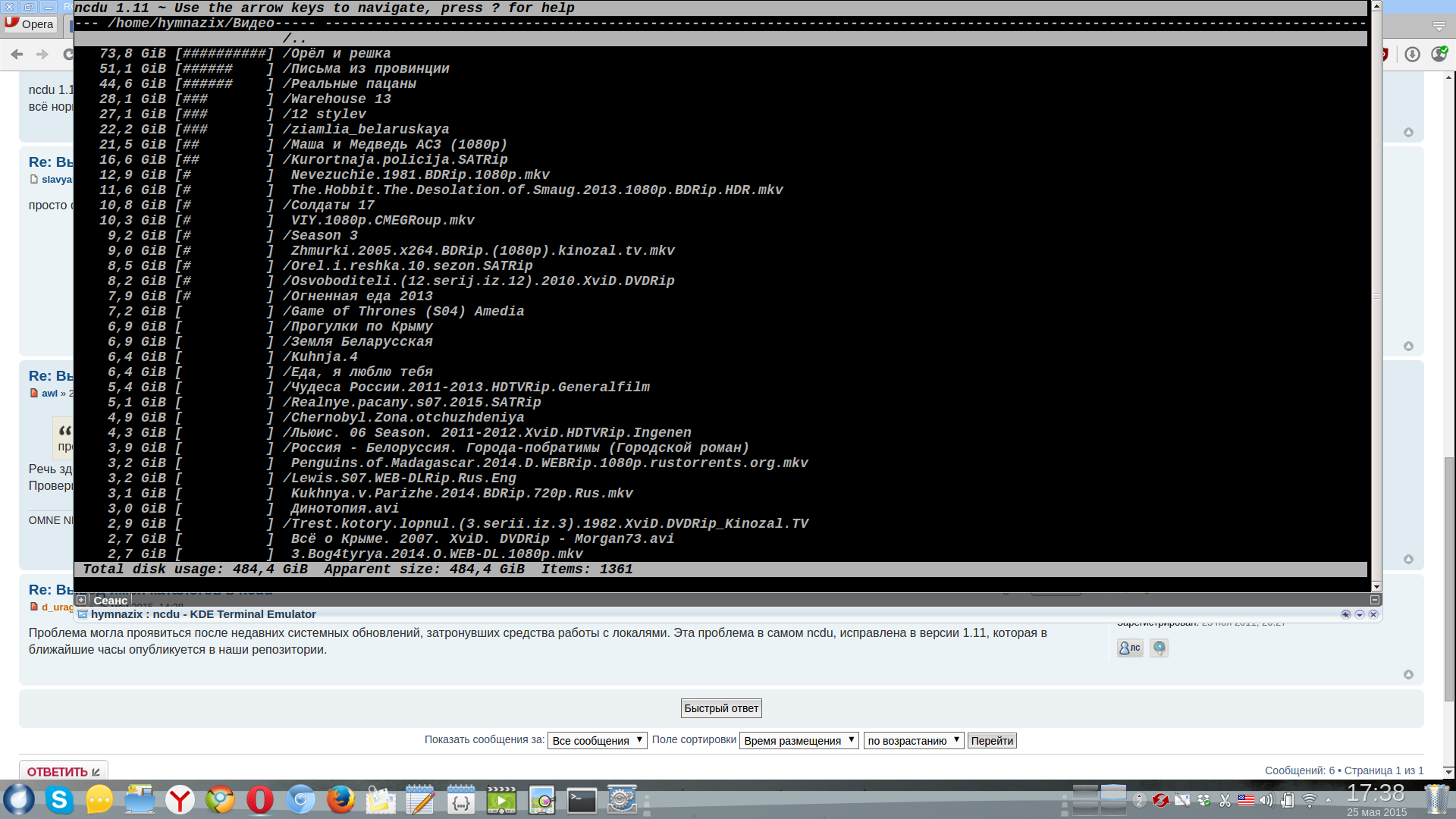 Пришло, исправлено.d_uragan писал(а):Проблема могла проявиться после недавних системных обновлений, затронувших средства работы с локалями. Эта проблема в самом ncdu, исправлена в версии 1.11, которая в ближайшие часы опубликуется в наши репозитории.