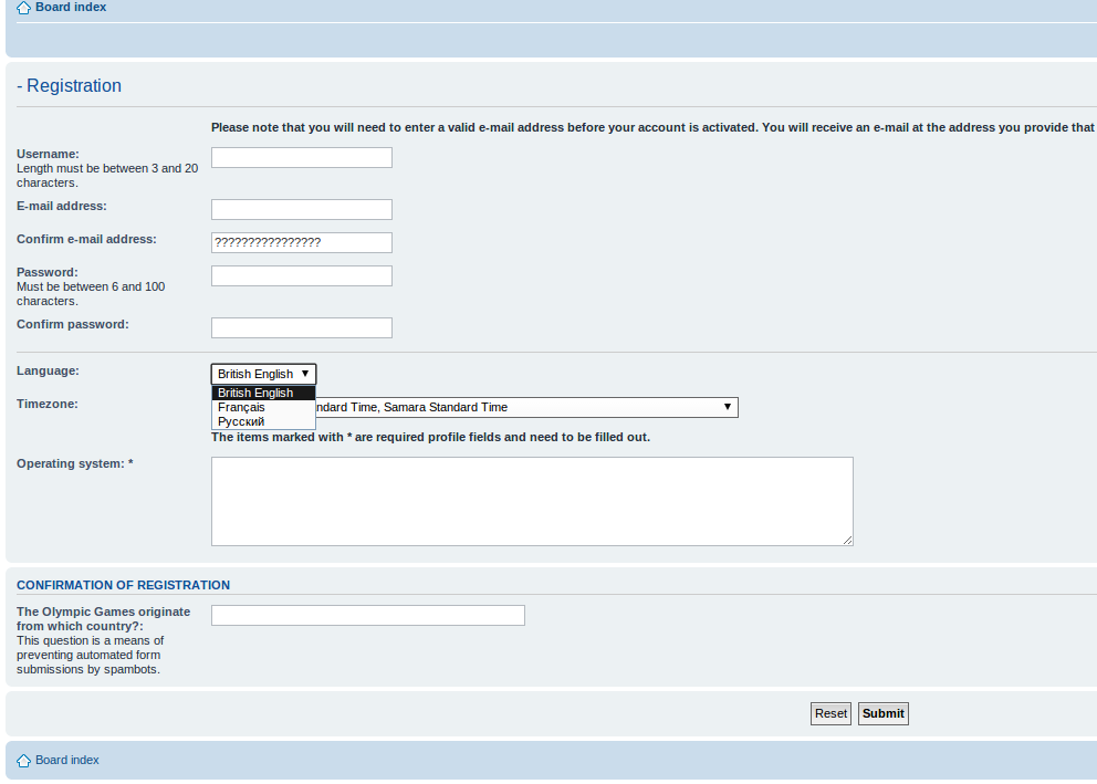 1) In order to prevent spammers registration, we have some anti-spam questions, both in Russian and English. To pick up question in your preferred language, just reload the form.
