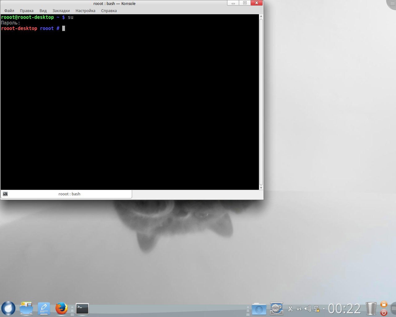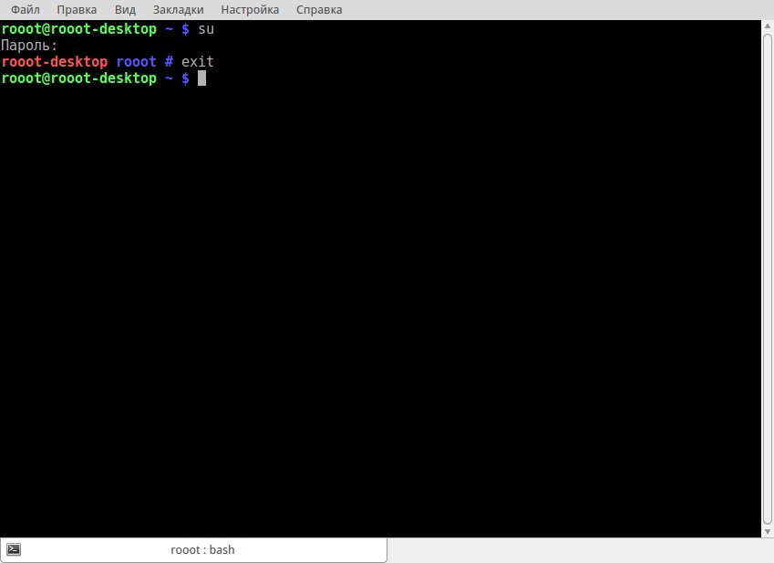 DELTA-79 писал(а):Расклад такой: вводите команду "su" после чего выводится слово "пароль" и курсор перестает быть активным и визуально не реагирует на нажатие клавиш, пока не нажмете "ENTER". Это нормально: система в этот момент "понимает" все, что вы нажимаете и сравнивает с заданным ранее паролем администратора. То есть после появления запроса "пароль" вводите пароль, не смотря на то, что курсор не двигается: так должно быть, это защита от "подглядок". После ввода правильного пароля и нажатия "ENTER", система переходит в режим ROOT (администратора). Для выхода из этого режима введите команду "exit" или сочетание Ctrl+"D"