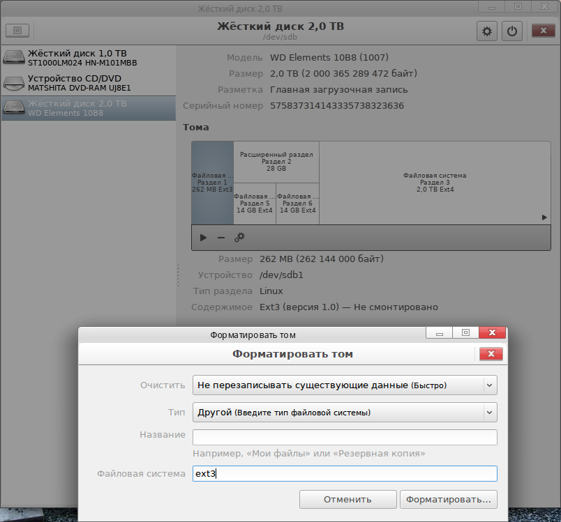GParted не может отформатировать внешний HDD 320Гб в ext2,3,4, мне нужна 3 чтобы в роутер воткнуть его. Что я делаю не так? В ntfs и hfs+ запросто, остановился на последней.