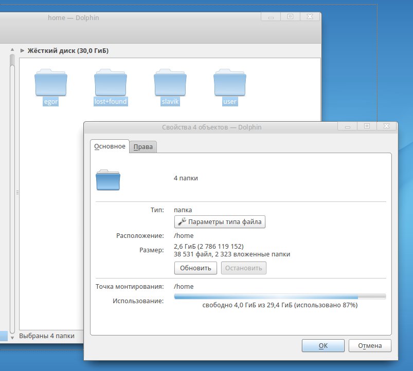slavik@pc-desktop ~ $ df /home Файловая система Размер Использовано Дост Использовано% Cмонтировано в /dev/sdb5 30G 25G 3,3G 89% /home