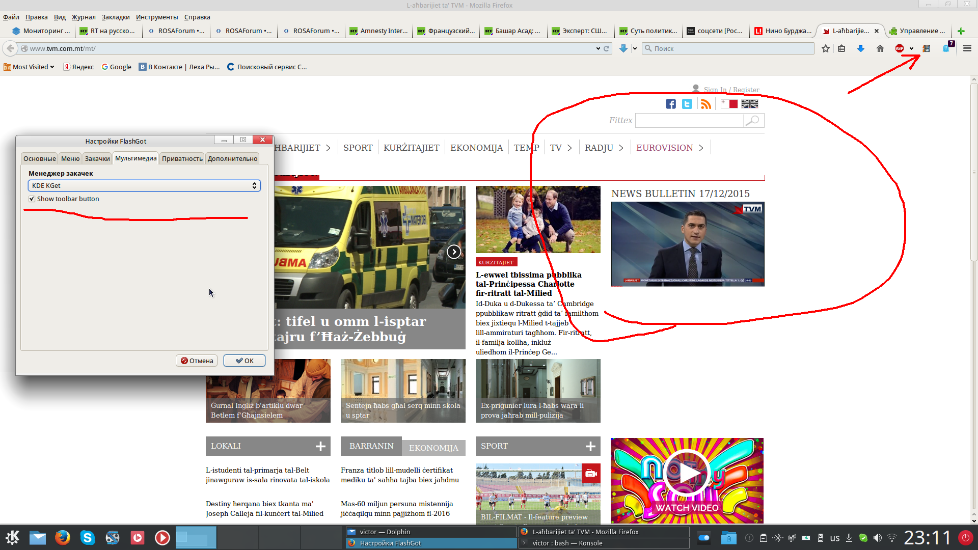 Там проблема в том, что FlashGot вообще не видит видео на странице, не только на сайте мальтийского ТВ, но вообще где бы то ни было. И там всё обновлено по последнему слову техники. А на 32-битном старичке, где всё работает, я систему не обновляю уже "сто лет", только браузер.