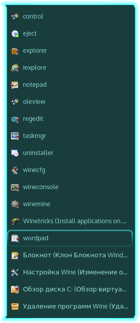 Ни в одном из главных меню (классическое, современное и доска приложений) ни одного значка связанного с wine не увидел.