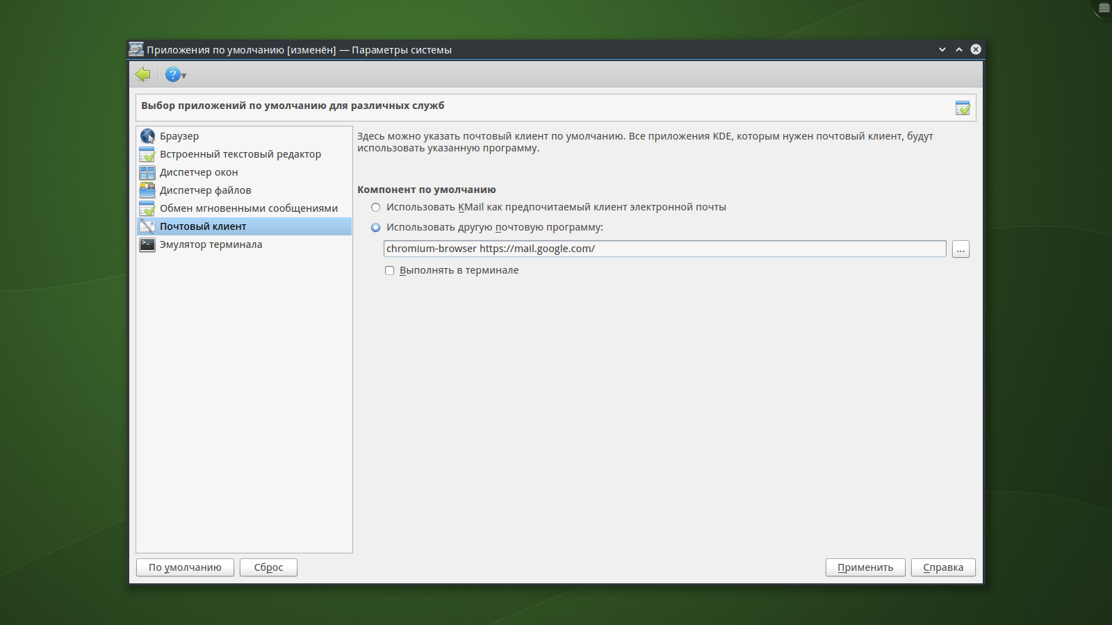Barmalei писал(а):Браузер прописать к почте по моему надо в «Приложений по умолчанию».
