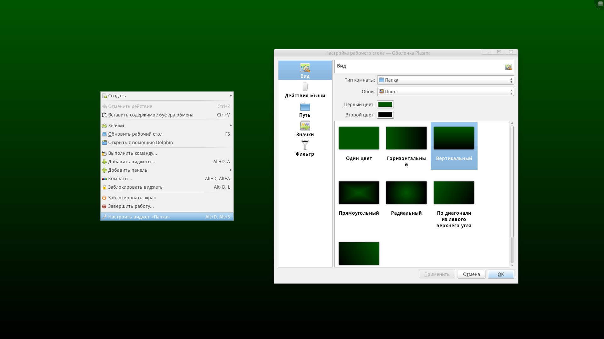 А есть ли там возможность установить градиент из двух цветов вместо обоев рабочего стола? Я когда установил Кубунту ради проверки — там 5-я Плазма (не знаю какая именно сборка) — заметил, что градиент не предусмотрен, что произвело малоприятное впечатление. В 4-й Плазме возможность поставить градиент есть.VictorR2007 писал(а):Сегодня собрал plasma 5.6.1.
