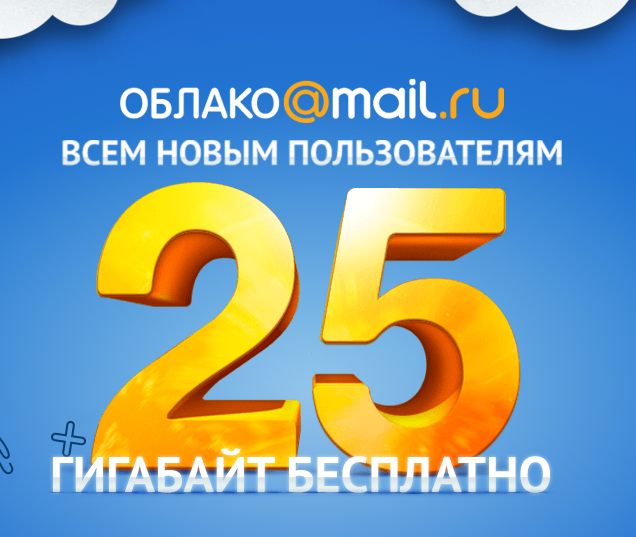 25 гб:Алзим писал(а): Вроде Майл.Облако 100 гб даёт. https://cloud.mail.ru/home/