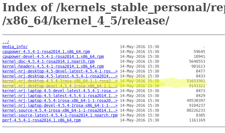 Я ставил позавчера kernel-nrj-laptop-4.5.3-1rosa-x86_64-1-1-rosa2014.1.x86_64.