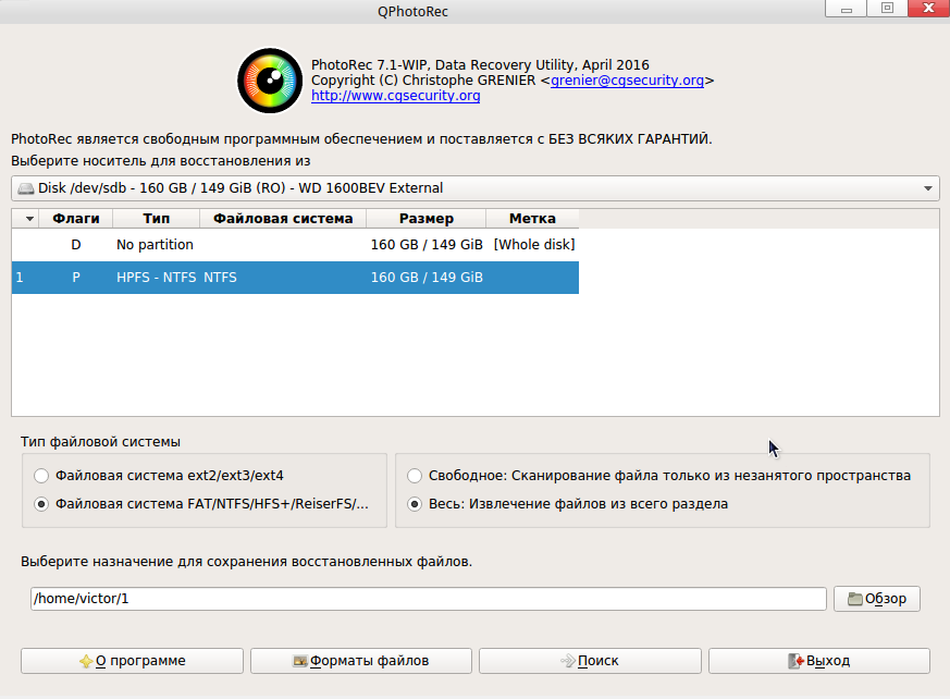 А вот входящая в него утилита qphotorec как раз для восстановления файлов.