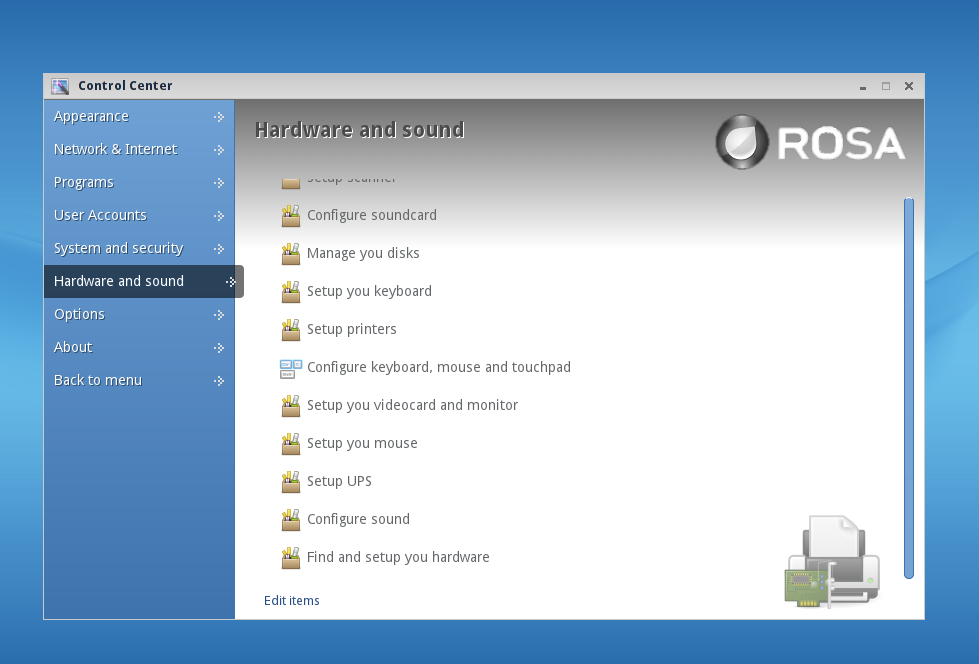 Hi ДроноваЮ! Sorry for the tardy reply. I am busy these days. Unfortunately, I don't have it installed now. But I remember where the errors were. When you open the control center, there is a section called "Hardware and sound". when you open this section, you see other subsections like "configure you ..." which must be "configure your ...". I will try to boot a live session of ROSA and make screen shots. meanwhile please give it a try and see if you can find about the errors I am talking about.