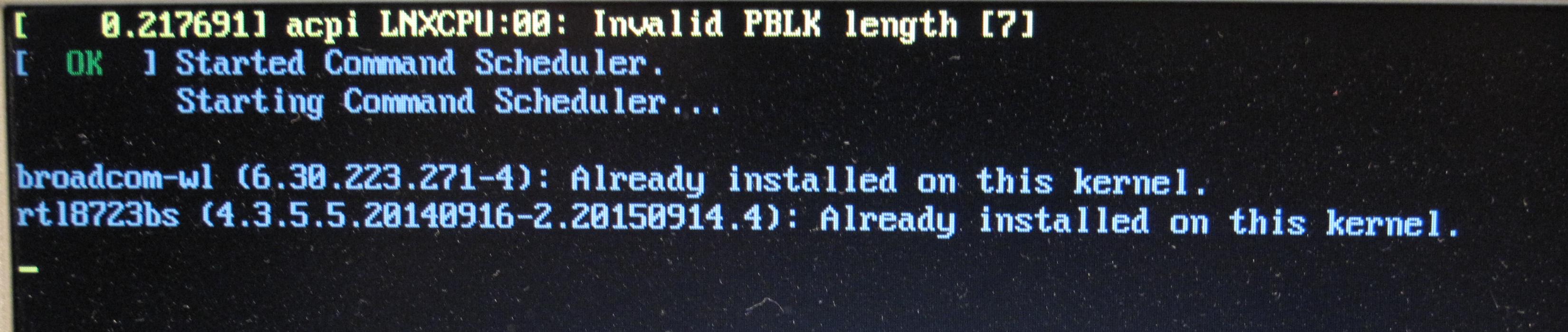 В консоль входит, но дальше черный экран и ничего не вводится, если вернуться на "На последних этапах установки, когда система спрашивает, какие службы ей включить (CUPS, Samba, sshd) перейти в вирт. консоль - ctrl-alt-f2" и нажать "дальше" и успеть нажать "ctrl-alt-f2" ввожу root, скачиваю ядро 4.1.32 , идет установка, а потом вот скрин дальше только перезагрузка. Проверяю ядро - старое 4.1.25