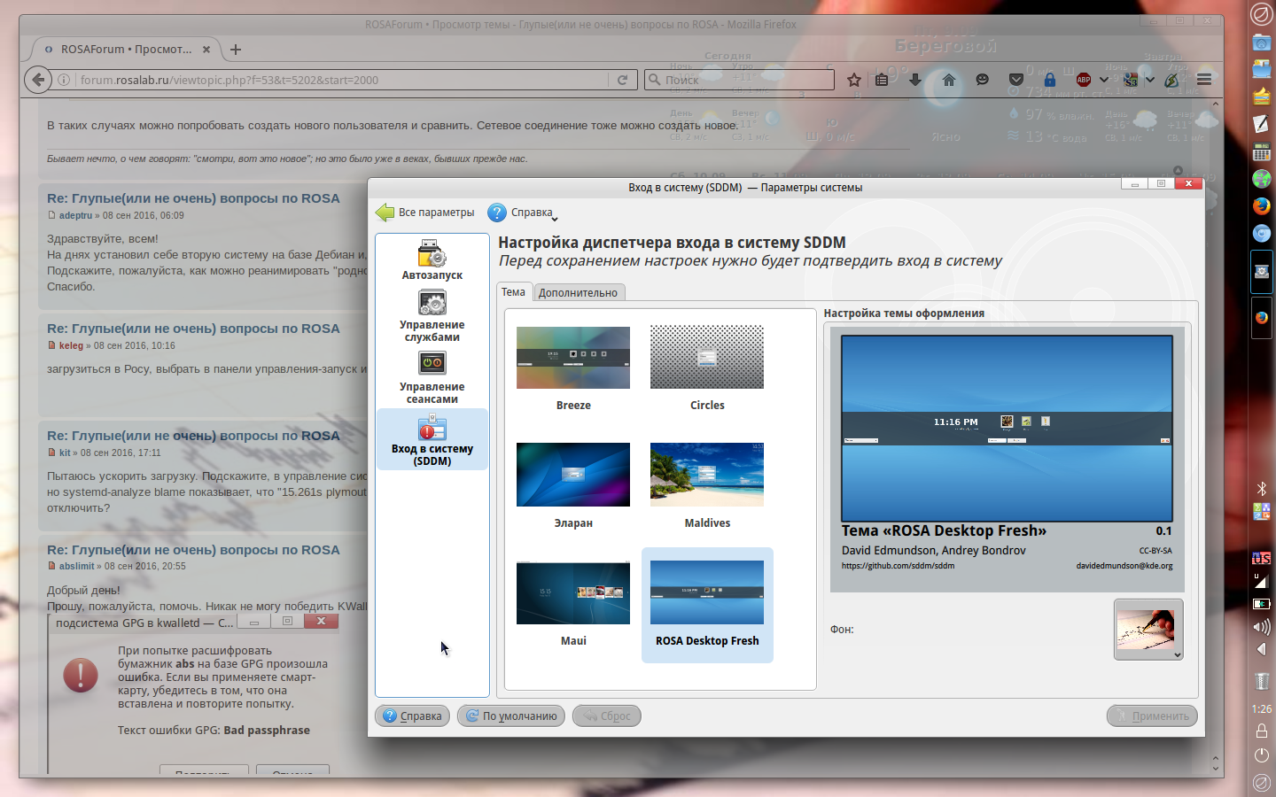 Причем ввести пароль он даже не предлагал. До этого при входе в систему выводил ошибку, что не запущен агент GnuPG, удалось поправить по следующей инструкции: https://wiki.archlinux.org/index.php/Gn ... 1.81.D0.BA , ошибка при загрузке системы больше не выводится, но проблема с KWallet не исчезла.