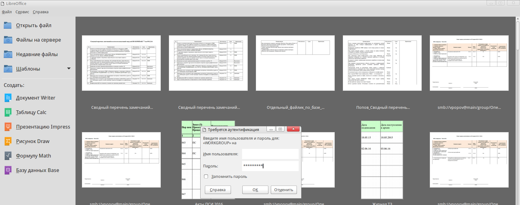 C чего вы взяли что конкретного пользователя? файл лежит на самбе, самба требуют аутентификацию для доступа. получается если я хочу сменить пользователя мне надо 300 раз подпрыгнуть для открытия файлов. А ежели LO лучше знает меня от какого пользователя открывать файл то наверное логично иметь форму только с вводом пароля. Вообще эта часть не работает как ожидается.