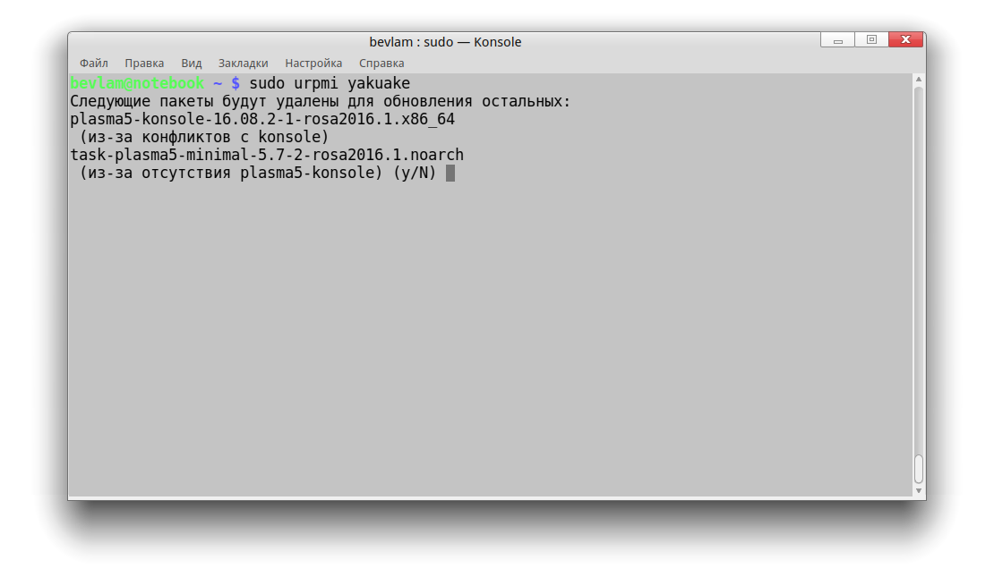 yakuake из репозиториев для kde4. Репозитории на всех общие.bevlam писал(а):При установке пакета yakuake, система сообщает об удалении пакетов из-за конфликтов с существующими, но ведь так не должно быть? Как же тогда попал пакет в репозитории, если он конфликтует с установленными? Или? Образ установленный: ROSA.FRESH.PLASMA.R9.16980.b.x86_64.uefi.iso, репозитории подключал так: # urpmi.addmedia --distrib http://abf-downloads.rosalinux.ru/rosa2 ... ry/x86_64/