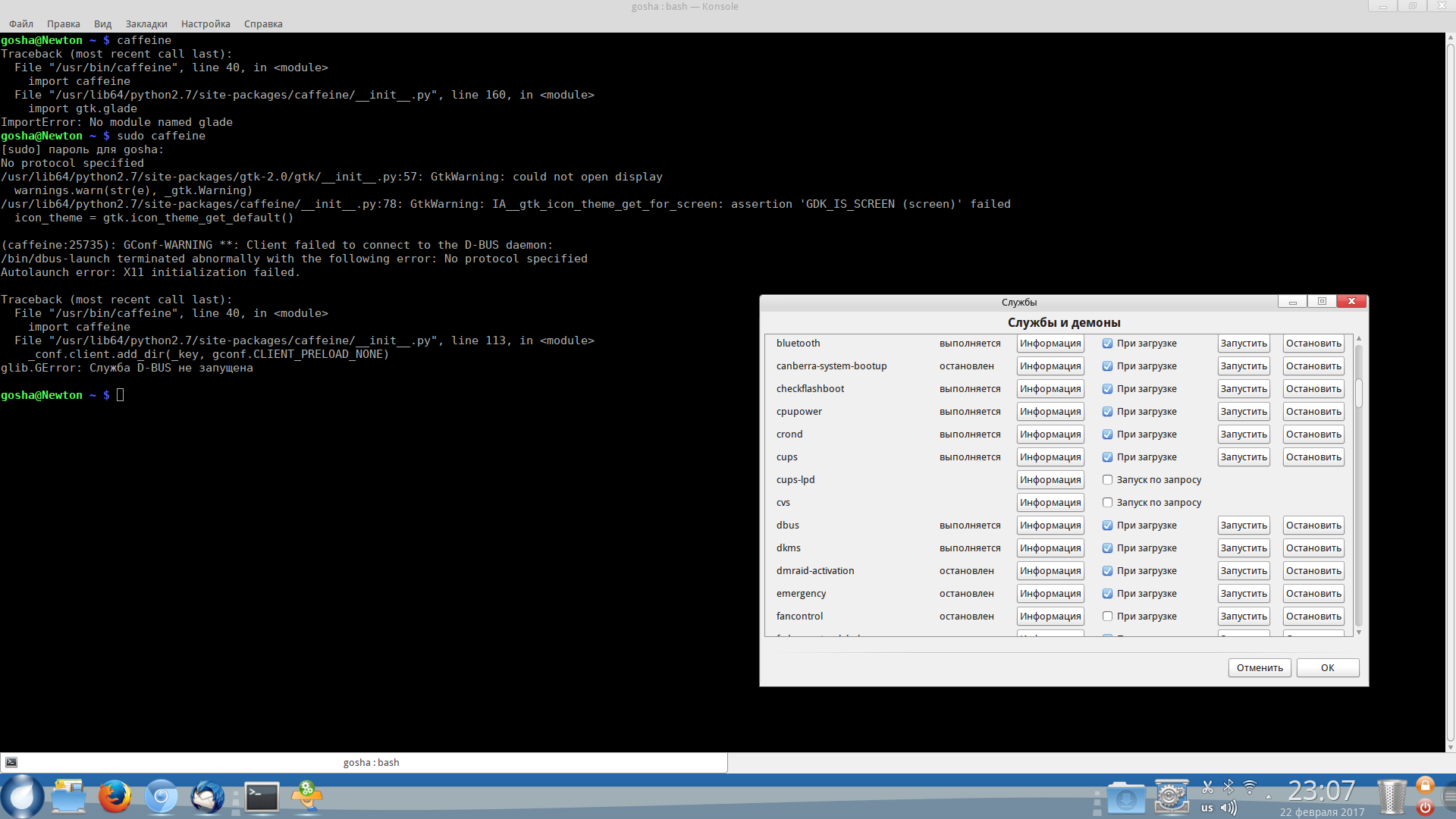 Графический интерфейс - вообще не запустился. Через консоль - результат в скрине. Там же справа на скрине - dbus - запущена, программа имеет альтернативное мнение по данному вопросу... :( ну и ещё чего то там... :)
