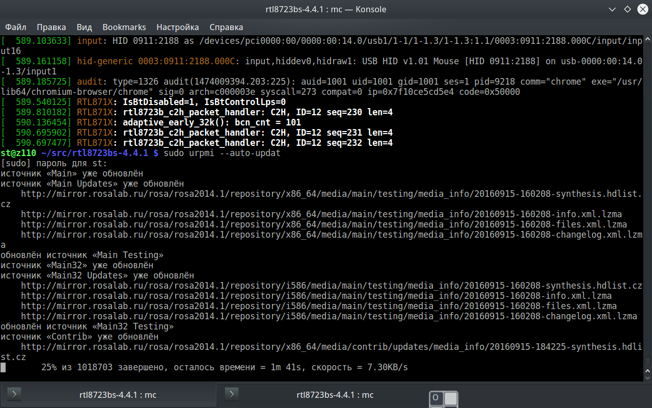 Дело не в драйвере, а в ядре. http://forum.rosalab.ru/viewtopic.php?f ... 280#p67736novokreshenov писал(а):Драйвер rtl8723bs все же сыроват, слабый уровень сигнала и медленная скорость(в среднем 10 кб/с).